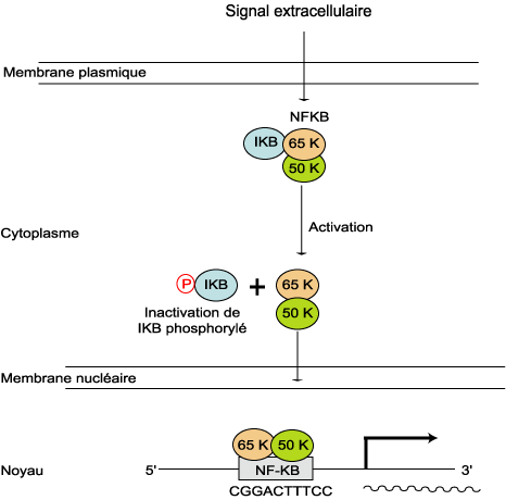 L'activation de NF-kB résulte de la phosphorylation IkB et de sa dégradation. Le dimère p65-p50 pénètre dans le noyau et se fixe dans la région promotrice des gènes possèdant des sites NF-kB, ce qui entraine une activité transcriptionnelle dite NF-kB.