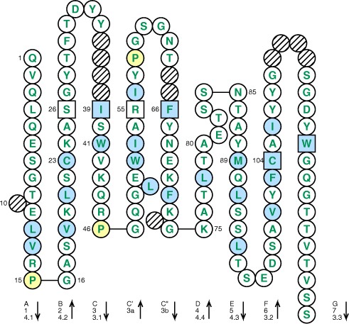Hatched circles or squares correspond to missing positions according to the IMGT unique numbering.