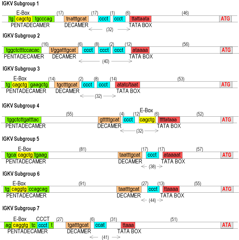 The motifs TATA_BOX, DECAMER, PENTADECAMER, CCCT, and E-Box have been defined by IMGT, based on sequence comparison and data from the literature [1] [2].