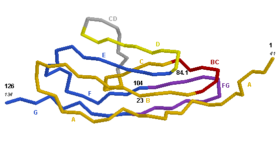 C-LIKE-DOMAIN strands are colored according to the IMGT color menu for strand representation: A, B and C strands (orange), transversal CD (grey), D strand (yellow), E, F and G strands (blue).